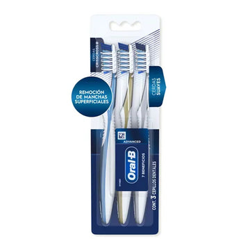El cepillo de dientes Oral-B 7 Beneficios, cuenta con Cerdas CrissCross te ayudarán a tener una mejor remoción de la placa. Tiene cerdas con punta redondeada que contribuyen a cuidar tus encías. Cuenta con cerdas indicadoras de cambio que se decoloran para avisar que es tiempo de remplazar tu cepillo, así como un limpiador de lengua y mejillas. Su mango es ergonómico para que tengas un mejor manejo a la hora del cepillado. La marca más usada por odontólogos en el mundo* *Basado en entrevistas con odontólogos de todas las regiones del mundo.