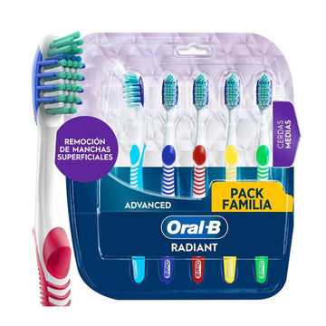 El cepillo de dientes Oral-B Advanced Radiant cuenta con cerdas interdentales que limpian entre tus dientes para contribuir con la remoción de las manchas superficiales de tus dientes. Sus cerdas de punta redondeada te ayudaran a cuidar tus encías, además cuanta con masajeadores de goma que estimularan a las encías. Tiene cerdas pulidoras, un limpiador de lengua y mejilla, además de una punta ultra efectiva que limpiará áreas de difícil alcance. cuida de tu sonrisa con los productos que Oral-B tiene para ti.