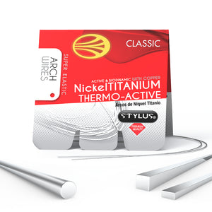 La principal propiedad del Nickel puro es su alta resistencia que, aunado con la actividad del Cobre, hace de este el mejor arco en el mercado. Le garantiza movimientos continuos y suaves, así como una flexibilidad total que reducirá el trauma en los tejidos de soporte del diente y de la reabsorción ósea indeseable, acortando el tiempo en sus tratamientos. Una vez colocado el arco en la boca recobrará su forma original gradualmente y, al entrar en acción con la temperatura corporal del paciente, se mantendrá constantemente activo. Incrementa sus propiedades termo activas, permitiendo que se produzcan fuerzas exactas para obtener movimientos óptimos y reducir al mínimo la fricción durante el tratamiento. Ideales para la nivelación y la alineación dental. Los Arcos Nickel Titanium Thermo-Active Classic Stylus® se encuentran conformados por una aleación de Nickel Titanio más Cobre, Poseen un rango de trabajo de 80 días aproximadamente, se activa a los 35° C, contiene en su aleación mayor cantidad de titanio, tiene alta resiliencia y flexibilidad total. Arcos STYLUS® son arcos de excelente calidad y fabricados con la tecnología de punta. STYLUS® le ofrece una amplia gama de arcos con aleaciones y materiales para satisfacer cada una de sus necesidades y cumplir con las especificaciones necesarias de la ortodoncia de vanguardia. Sello de garantía de calidad de todos nuestros productos Premium Quality.