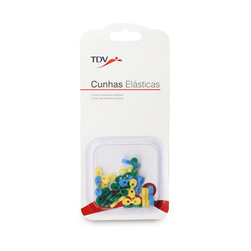 Cuñas interdentales elásticas. Las Cuñas Elásticas TDV son indicadas para el uso general en procedimientos restauradores, son compatibles con todos los sistemas de matrices. Poseen la función mecánica de adaptar matrices y/o separar dientes adyacentes, actuando simultáneamente por las fases vestibular y lingual. Producidas en 3 diferentes tamaños diferenciados por colores. 3,2 mm – Azul – indicada para casos de cavidades poco profundas. 2,6 mm – Amarilla – indicada para casos de cavidades profundidad media 2,0 mm – Verde – indicada para cavidades profundas.