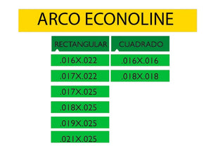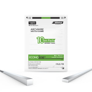 Arcos NI-TI Econoline® cuadrados y rectangulares son ideales para tratamientos en los que no pueden utilizar unos de costo elevado, sin sacrificar las fuerzas y movimientos óptimos para lograr un tratamiento exitoso. Su calibre es exacto y su conformación le permite colocarlos con facilidad en el slot brindando una fuera activa mayor a 52 días. El arco de nickel titanium está indicado para la nivelación y la alineación dental. Posee una marca grabada sobre la línea media que le ayudará a colocarlo en los maxilares. Este arco posee las principales propiedades del nickel titanium convencional que se alía con el cobre para darle no sólo memoria al arco, sino que, al estar en juego con la temperatura corporal del paciente, se lograrán movimientos suaves y continuos. El resultado son tratamientos más confortables para sus pacientes en menor tiempo. La marca ECONOLINE®, se desprende de nuestra marca Stylus®, Son arcos que le ofrecen calidad con forma y propiedades que se requieren para garantizar sus tratamientos.