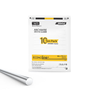 Arcos NI-TI Econoline® es una alternativa que le ofrece productos de calidad a un precio más accesible obteniendo óptimos resultados. Son arcos redondos que le ofrecen calidad con forma y propiedades que se requieren para garantizar sus tratamientos. Cuenta con una aleación especial de nickel titanium con cobre que proporciona mayor resiliencia y un rango de trabajo mayor a 52 días. El arco de nickel titanium está indicado para la nivelación y la alineación dental. Su calibre exacto y su conformación le permitirá colocarlos en el slot con facilidad, respetando la forma de la arcada. Posee una marca grabada sobre la línea media que le ayudará a colocarlo en los maxilares. Este arco posee las principales propiedades del nickel titanium convencional que se alía con el cobre para darle no solo memoria al arco, sino que, al estar en juego con la temperatura corporal del paciente, se lograrán movimientos suaves y continuos. El resultado son tratamientos más confortables para sus pacientes en menor tiempo. Tiene grabada sobre la línea media una marca para colocarlo correctamente en los maxilares. La marca ECONOLINE®, se desprende de nuestra marca Stylus®.
