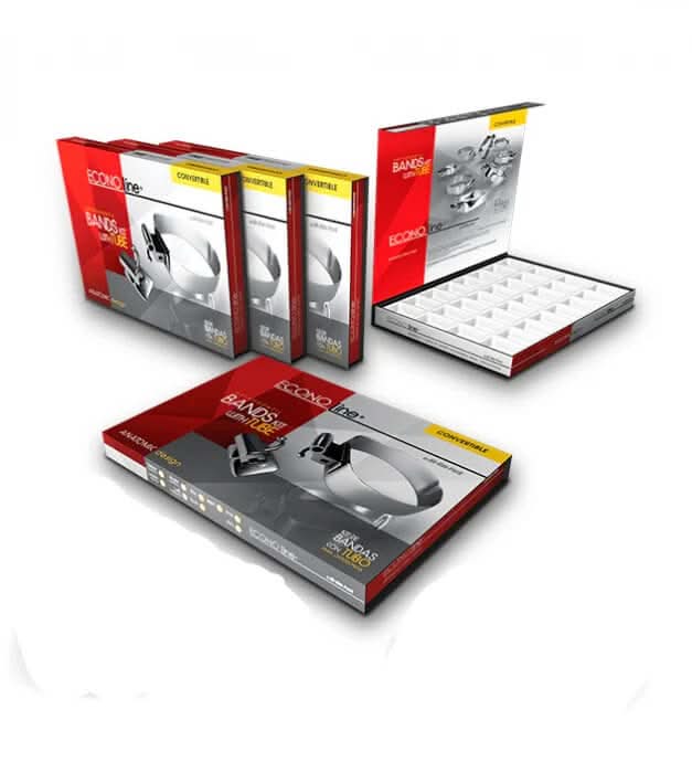 Los tubos Roth de las bandas están soldados a la altura exacta con láser para evitar que se desprendan durante el tratamiento. Porque conocemos el mercado, le ofrecemos una banda anatómica de acero inoxidable con un precio accesible para sus tratamientos ortodónticos. Es una nueva línea de bandas respaldada por STYLUS®. Características: Precisión anatómica que garantiza un ajuste perfecto en los molares y asegura la retención. La anatomía de las bandas es ideal para cada cuadrante, completamente proporcionales en todos los planos y para cada tamaño de los molares. El acero inoxidable del cual están hechas brinda la “fuerza” necesaria para evitar fracturas. 120 bandas anatómicas con tubo doble en superior y sencillo en inferior, soldados con láser. Elaboradas con acero inoxidable totalmente maleables para asegurar la adaptación. Arenadas en la parte interna, que garantizan una cementación precisa y duradera.