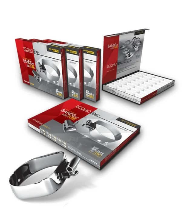 Los tubos Roth de las bandas están soldados a la altura exacta con láser para evitar que se desprendan durante el tratamiento. Porque conocemos el mercado, le ofrecemos una banda anatómica de acero inoxidable con un precio accesible para sus tratamientos ortodónticos. Es una nueva línea de bandas respaldada por STYLUS®. Características: Precisión anatómica que garantiza un ajuste perfecto en los molares y asegura la retención. La anatomía de las bandas es ideal para cada cuadrante, completamente proporcionales en todos los planos y para cada tamaño de los molares. El acero inoxidable del cual están hechas brinda la “fuerza” necesaria para evitar fracturas y es a la vez bastante maleable para realizar un rápido ajuste. 120 bandas anatómicas con tubo doble en superior y senciillo en inferior, soldados con láser. Elaboradas con acero inoxidable. Arenadas en la parte interna, que garantizan una cementación precisa y duradera.